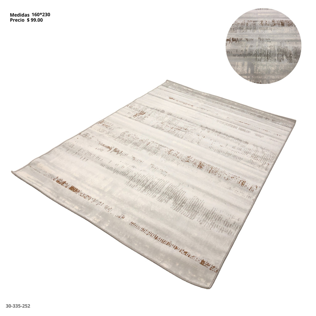 Alfombra en tonos beige claro con detalles sutiles en gris y marrón. Su diseño moderno con efecto desgastado aporta un aire elegante y cálido a cualquier espacio, ideal para salas, dormitorios o comedores.