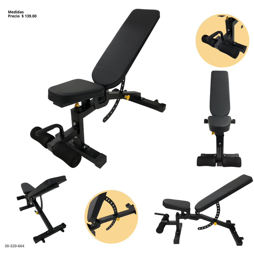Banco multifuncional ajustable, ideal para entrenamientos de fuerza y tonificación en casa o gimnasio. Su diseño permite realizar ejercicios en diferentes posiciones (plano, inclinado y declinado), adaptándose a rutinas variadas como press de pecho, abdominales, ejercicios con mancuernas y más.