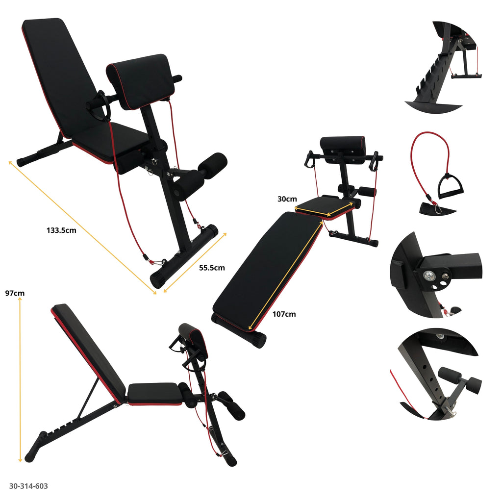 Incluye respaldo regulable, predicador para bíceps, cuerda elástica de resistencia y soporte acolchado para mayor comodidad.