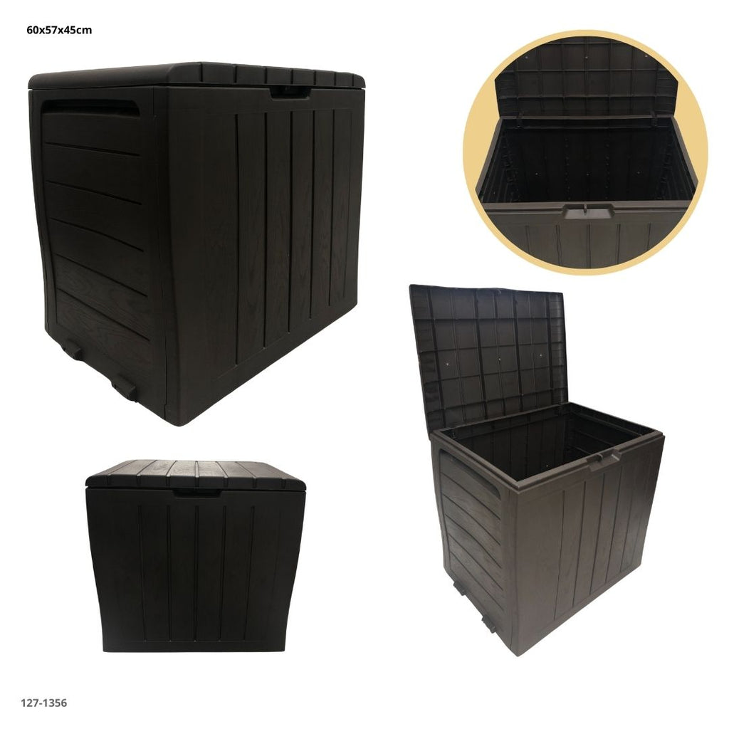 Un práctico baúl organizador multipropósito con diseño moderno y resistente, ideal para mantener tus espacios siempre ordenados. Su acabado tipo madera en color oscuro le da un aspecto elegante, mientras que su material plástico de alta durabilidad lo hace perfecto tanto para interior como para exterior.