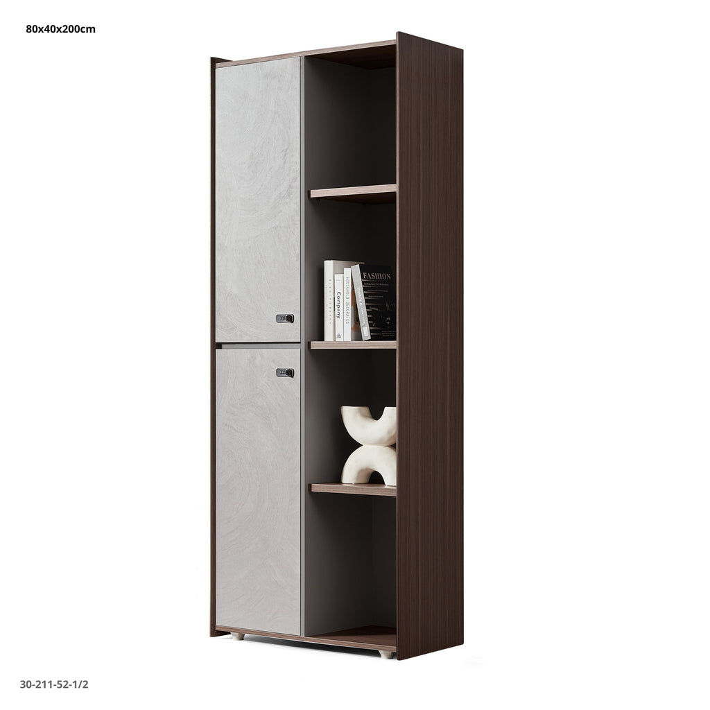 La estructura en acabado madera con puertas en tono gris claro brinda un contraste moderno y sofisticado, ideal para oficinas ejecutivas o espacios de trabajo con estilo.