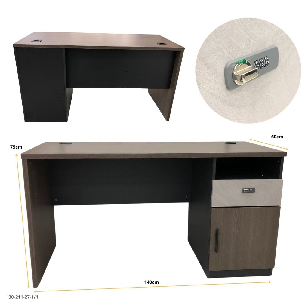 Incluye una gaveta con cerradura de combinación numérica para mayor seguridad, un compartimiento abierto de fácil acceso y un módulo inferior con puerta abatible para almacenamiento adicional. Además, cuenta con pasacables superiores que mantienen el área organizada y libre de desorden visual.