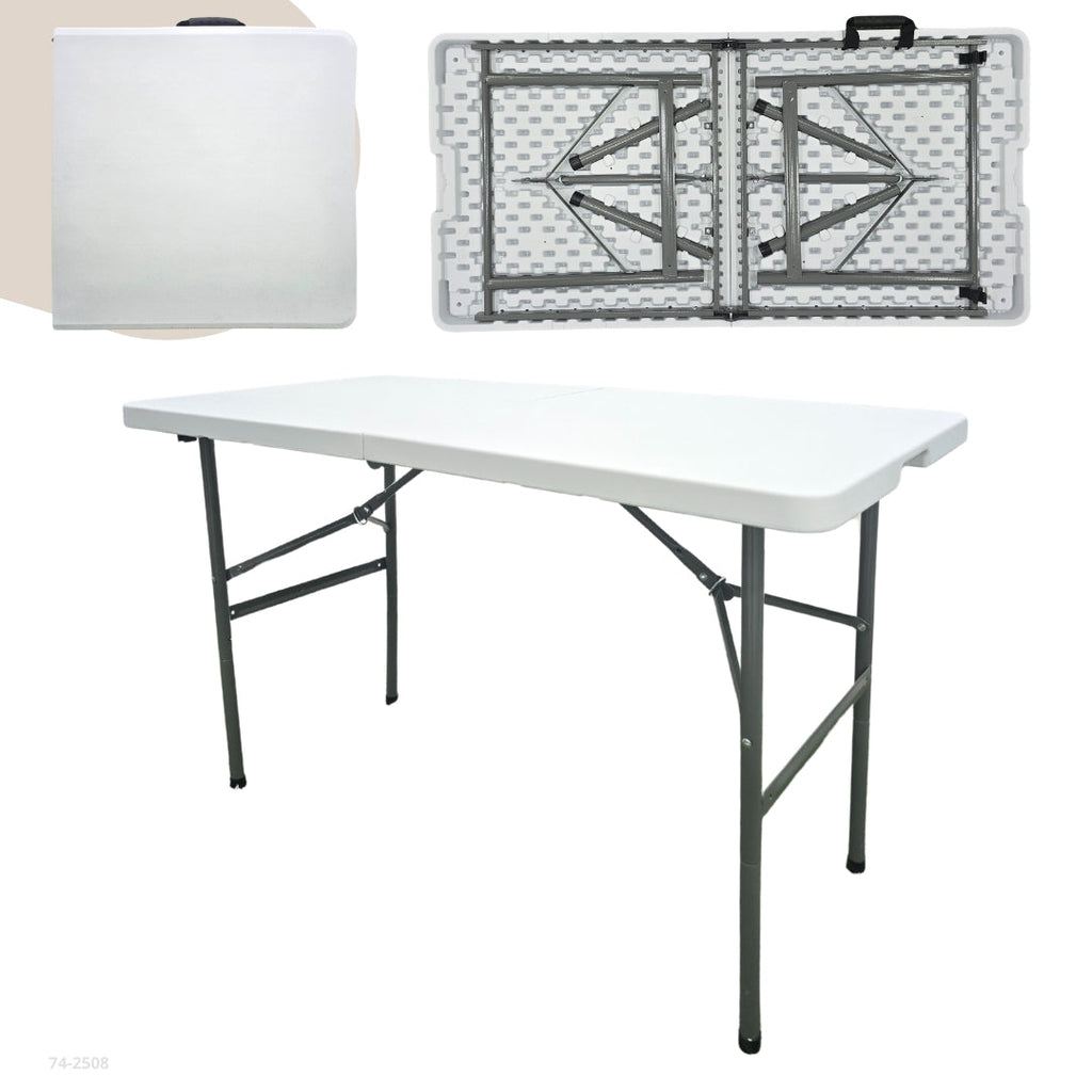 Esta mesa plegable rectangular es resistente, funcional y perfecta para todo tipo de ocasiones. Su diseño permite plegarla a la mitad, facilitando el transporte y almacenamiento gracias a su asa integrada. Ideal para eventos, comidas familiares, reuniones o actividades al aire libre.