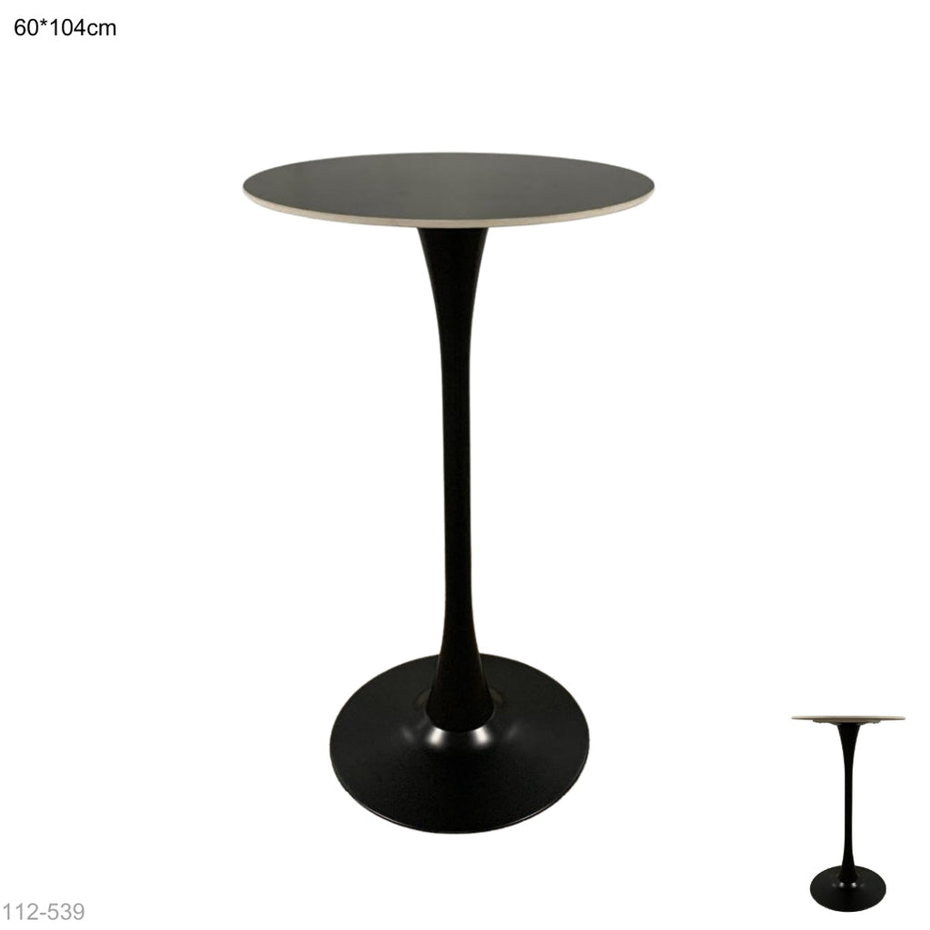 Mesa alta redonda con diseño moderno y elegante. Su base metálica tipo pedestal aporta estabilidad, mientras que el tablero de acabado mármol en color negro le da un estilo sofisticado y versátil. Ideal para bares, terrazas, restaurantes o eventos.