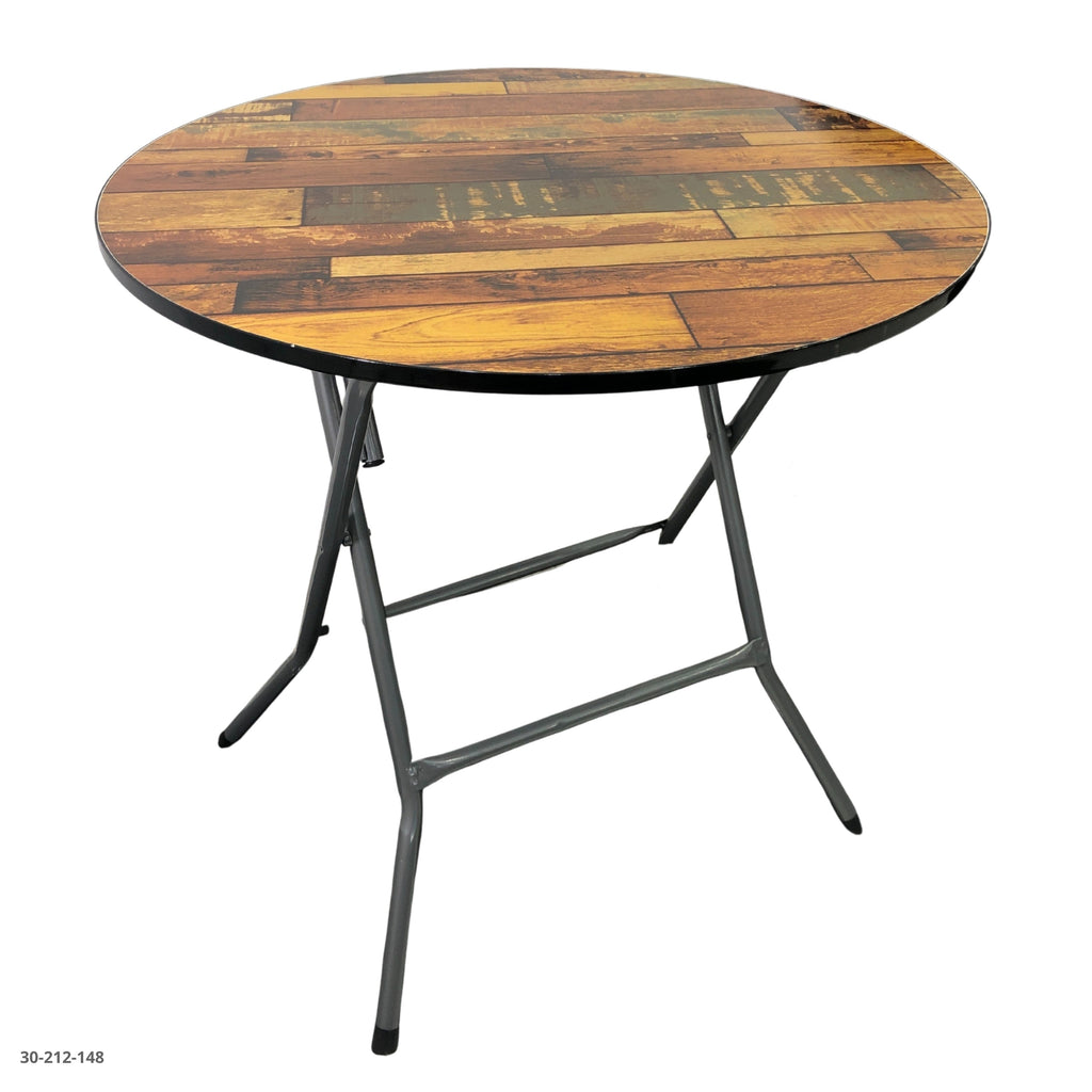 Mesa redonda plegable con acabado tipo madera rústica, ideal para quienes buscan un diseño cálido y natural en sus espacios. Su estructura metálica plegable la hace fácil de guardar, resistente y práctica para transportar.