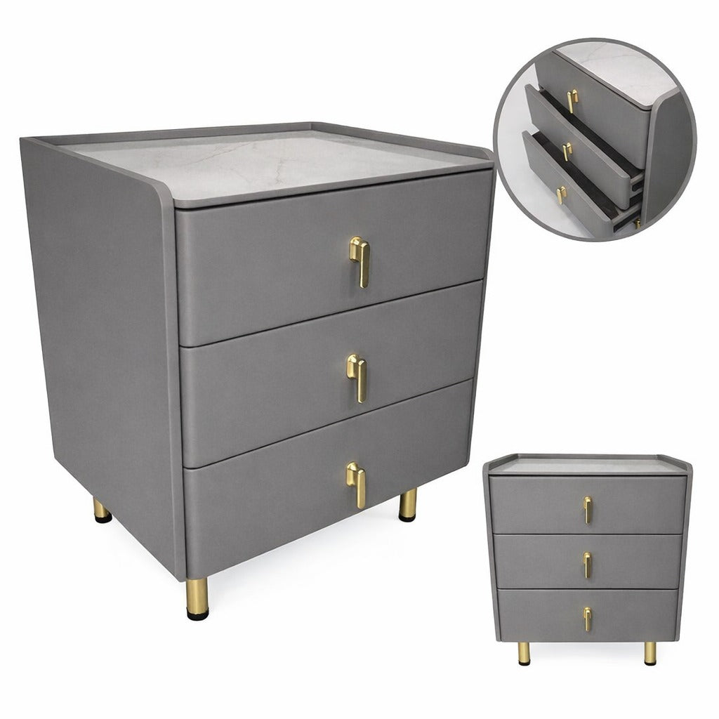 Mesa de noche moderna de 3 gavetas, en acabado gris oscuro con superficie estilo mármol. Su diseño sobrio y elegante la convierte en una pieza ideal para dormitorios minimalistas o contemporáneos.
