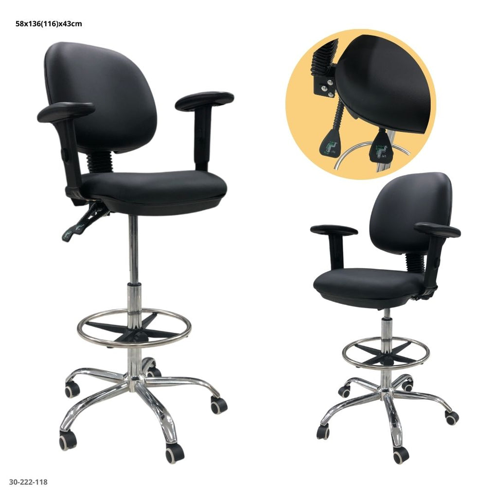 Esta silla de oficina alta con tapizado en cuerina ofrece confort, elegancia y funcionalidad para espacios de trabajo, mostradores o áreas de atención al cliente.