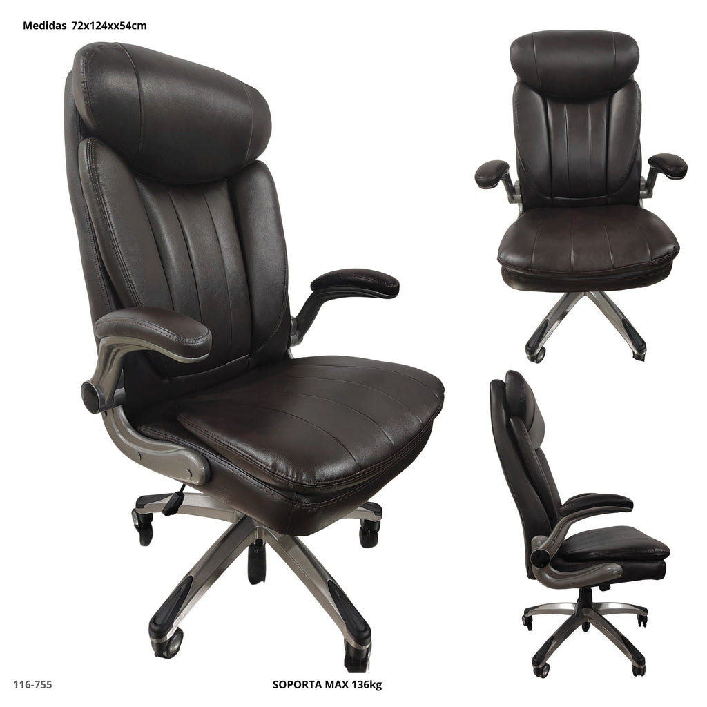 Silla ejecutiva de estilo clásico, fabricada en cuero sintético de alta calidad en tono marrón oscuro. Su respaldo alto y acolchado ofrece soporte adecuado para la espalda, mientras que el asiento amplio brinda comodidad durante horas de uso.