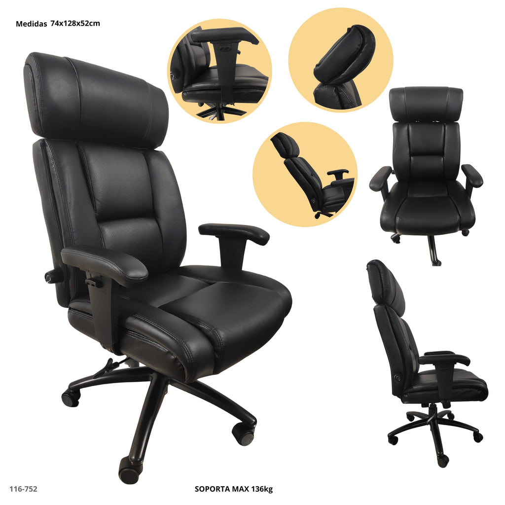 Silla ejecutiva con diseño ergonómico y respaldo alto, ideal para largas jornadas en oficina o home office. Su tapizado en cuero sintético negro ofrece un estilo elegante y profesional, mientras que el doble acolchado en respaldo y asiento garantiza mayor comodidad.