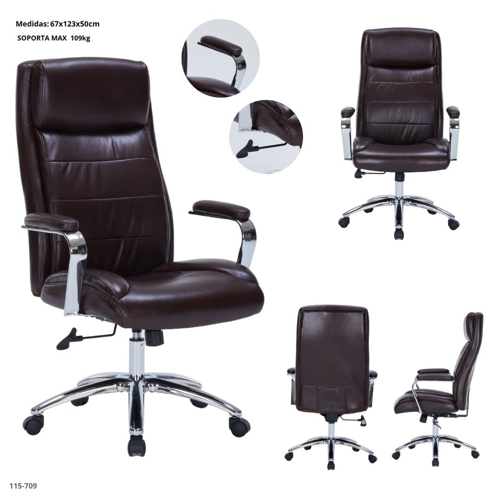 Silla ejecutiva ergonómica con respaldo alto, tapizada en cuero sintético color marrón, brazos metálicos cromados con apoyabrazos acolchados, y base cromada con ruedas.