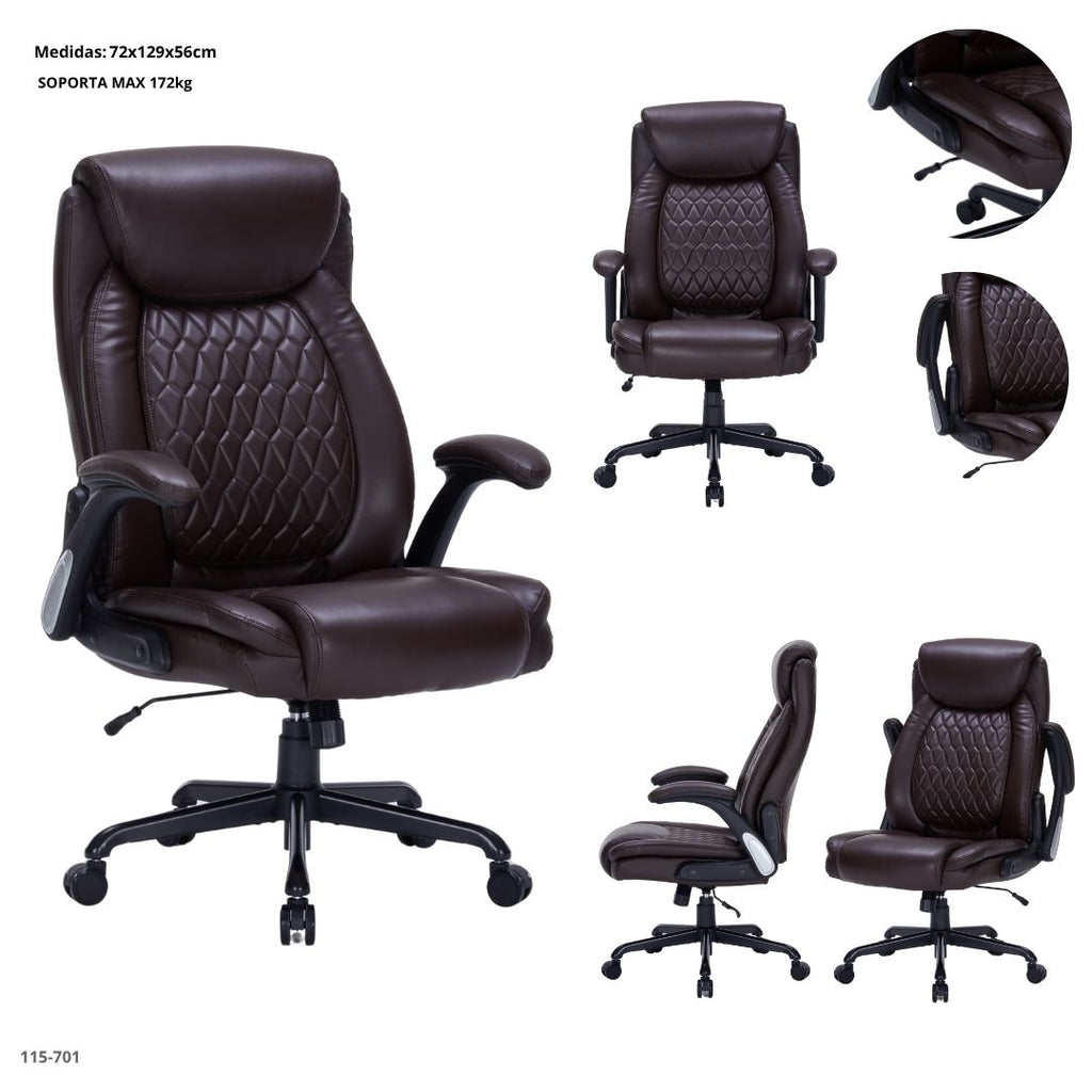 Tapizada en cuero sintético marrón de primera calidad, combina comodidad y durabilidad. Incorpora mecanismo de elevación y reclinación, apoyabrazos acolchados y base metálica de cinco ruedas para máxima movilidad.