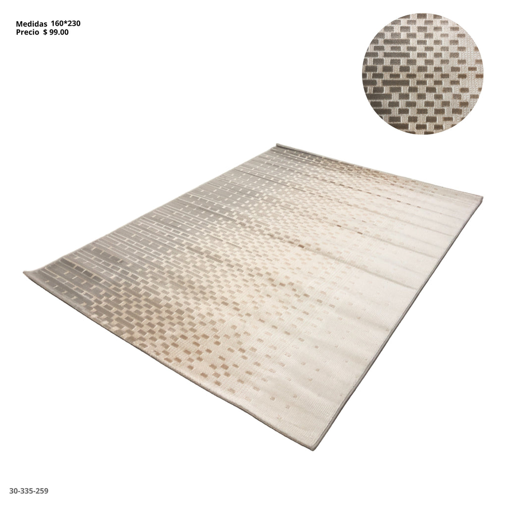 Alfombra en tonos beige y gris con diseño geométrico degradado de cuadros pequeños. Su estilo moderno y elegante se adapta a diferentes ambientes, ideal para salas, comedores o dormitorios, aportando calidez y sofisticación.
