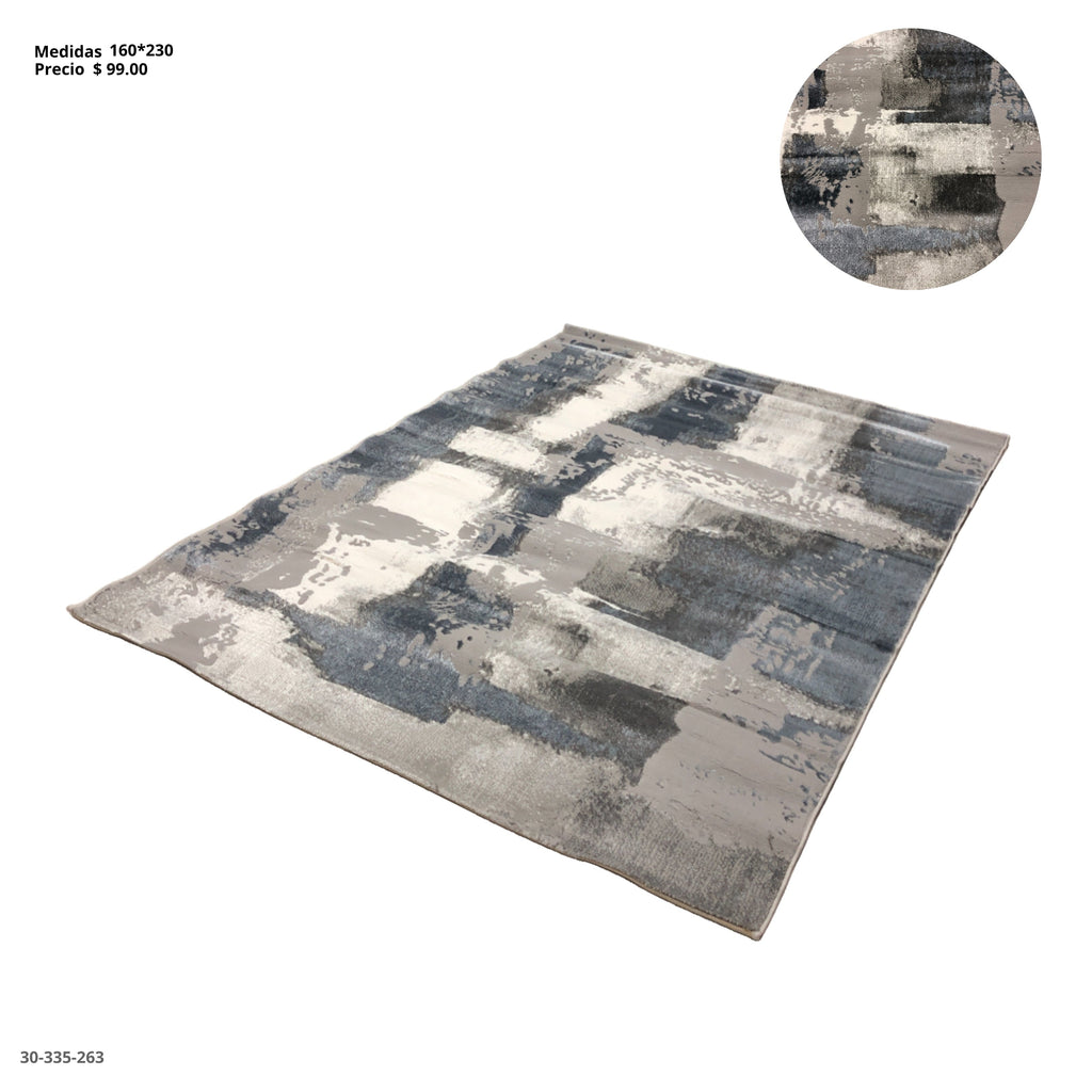 Alfombra moderna con diseño abstracto en tonos gris, azul y blanco. Su estilo artístico y contemporáneo le da personalidad a cualquier espacio, ideal para salas, comedores u oficinas. Fabricada con materiales resistentes y fáciles de mantener.