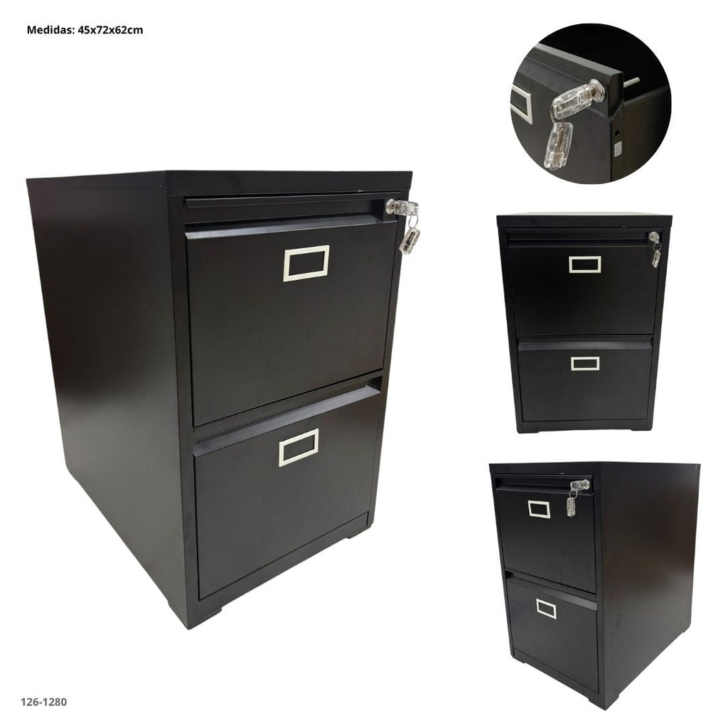 Archivo de dos cajones con cerradura, ideal para oficinas, estudios o espacios de trabajo que requieren almacenamiento seguro y organizado.