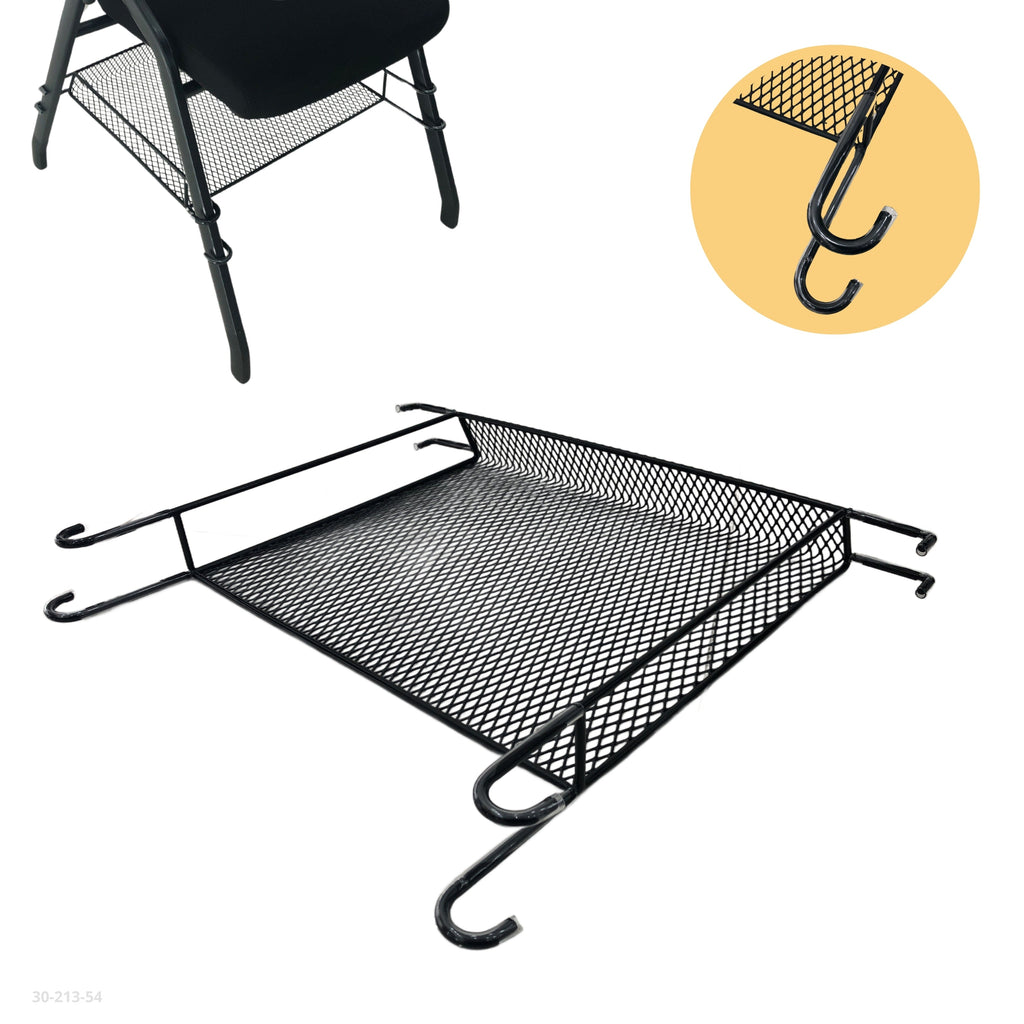 Fabricado en acero reforzado con acabado negro, ofrece gran resistencia y durabilidad. Su diseño en malla metálica expandida permite la ventilación y facilita la limpieza, mientras que los ganchos laterales integrados aseguran una instalación sencilla y firme bajo las sillas o pupitres plegables.