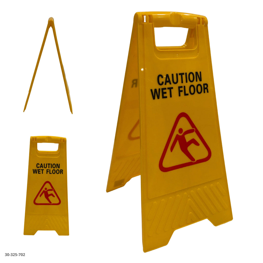 El mensaje “Caution Wet Floor” con pictograma de advertencia en color rojo y negro asegura alta visibilidad para peatones y empleados, incluso en zonas de alto tránsito.