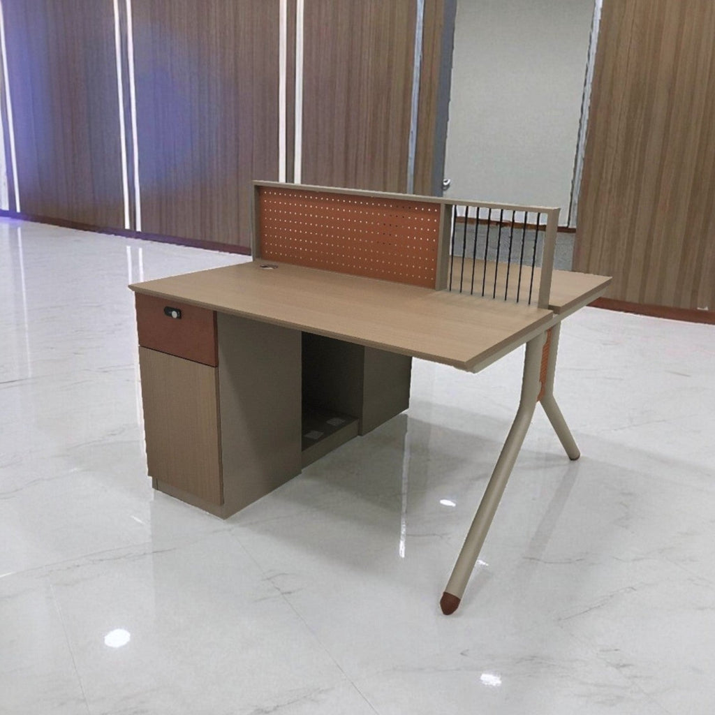 Este escritorio individual combina diseño funcional y estilo moderno, ideal para oficinas o estaciones de trabajo compartidas. Su estructura en tonos madera clara y taupe crea un ambiente cálido y profesional, mientras que los detalles metálicos aportan un toque contemporáneo.