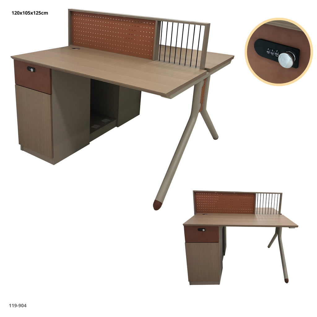 Cuenta con un panel divisor perforado que brinda privacidad y permite organizar accesorios o notas de trabajo. Incluye también módulo lateral con cerradura de seguridad digital y espacio inferior para almacenamiento o CPU. Su diseño ergonómico aprovecha al máximo el espacio, ofreciendo comodidad y eficiencia durante la jornada laboral.