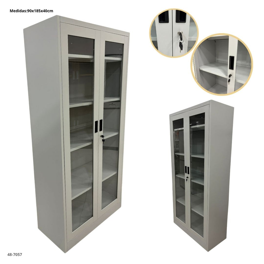 Este archivador metálico con puertas de vidrio ofrece una solución práctica y elegante para organizar documentos, libros o artículos de oficina.