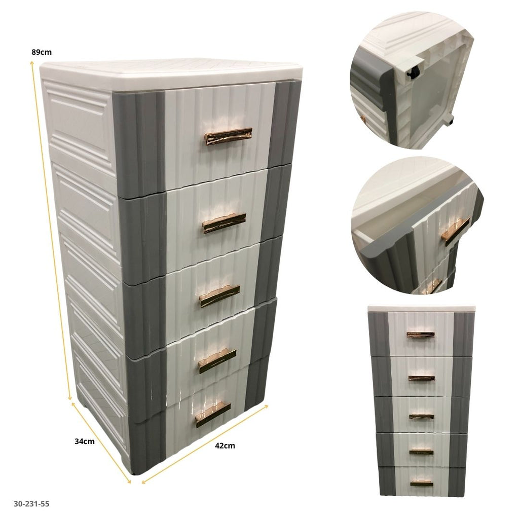 Este gavetero plástico de 4 niveles combina diseño moderno con funcionalidad práctica para mantener cualquier espacio organizado. Su acabado en tonos gris y blanco con manijas doradas le da un toque elegante y contemporáneo, ideal para dormitorios, oficinas o baños.