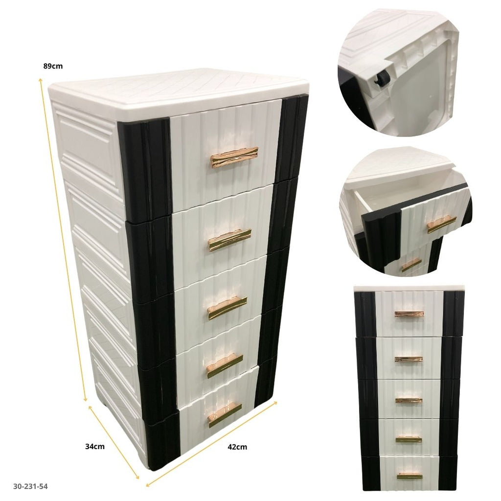 Fabricado en plástico resistente de alta calidad, ofrece durabilidad y facilidad de limpieza. Sus cajones amplios y de deslizamiento suave permiten guardar ropa, accesorios o artículos de uso diario, aprovechando el espacio de manera práctica y estética.