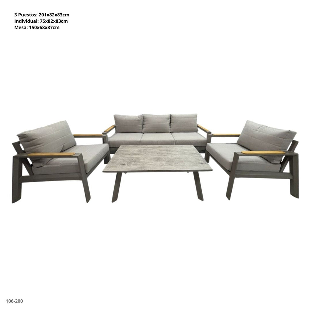 Juego de terraza 106-200, fabricado en estructura metálica con descansabrazos en madera y cojines en tono beige claro. La mesa rectangular cuenta con superficie estilo piedra, que aporta un acabado sofisticado y moderno, ideal para áreas sociales, terrazas o jardines.