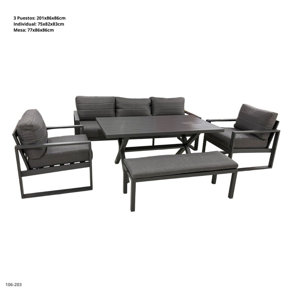 Juego de terraza/comedor de exterior moderno y elegante, fabricado en estructura metálica con cojines acolchados en tela gris de alta resistencia. Perfecto para reuniones familiares, espacios sociales o áreas al aire libre.