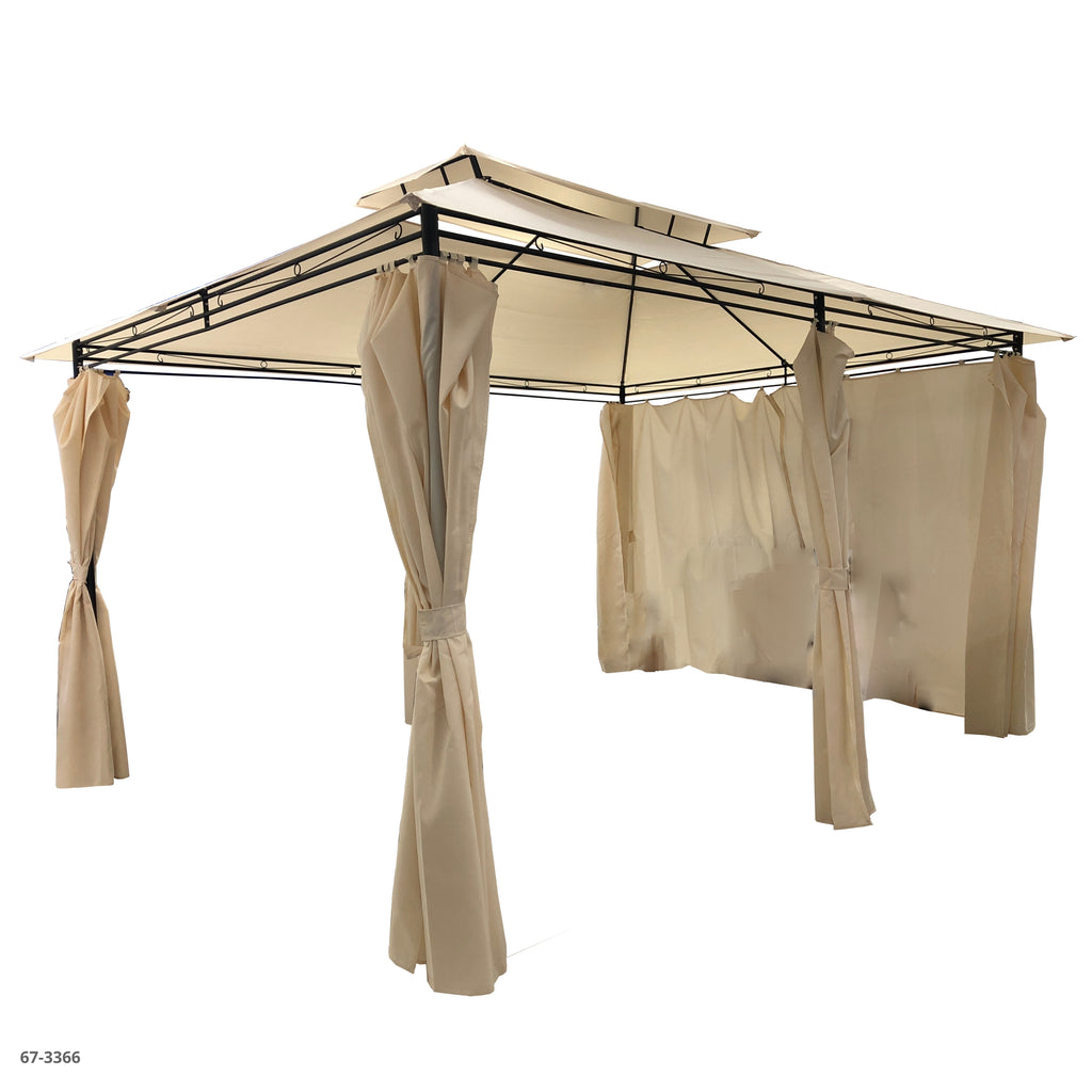 Este elegante gacebo con cortinas laterales es perfecto para crear un ambiente fresco y privado en tu jardín, terraza o patio. Su estructura metálica resistente y techo de doble nivel mejora la ventilación y brinda protección contra el sol. Las cortinas decorativas no solo suman estilo, también ofrecen sombra y privacidad cuando lo necesitas. ¡Ideal para reuniones al aire libre o momentos de relax! ??????