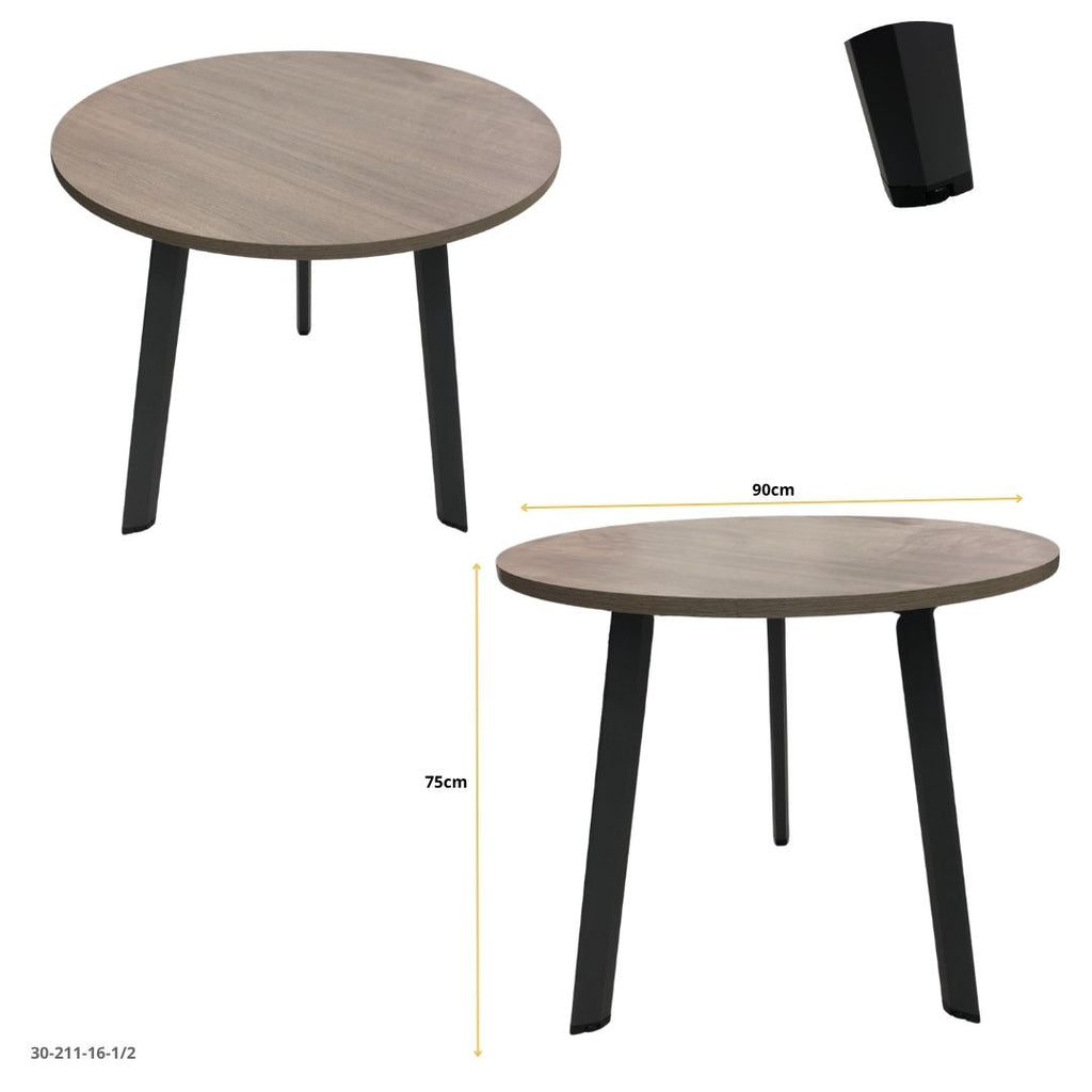 Esta mesa redonda moderna destaca por su diseño minimalista y elegante, ideal para comedores, oficinas o salas de reuniones. Su tablero en tono madera natural aporta calidez al espacio, mientras que las patas metálicas negras ofrecen firmeza y un estilo contemporáneo.