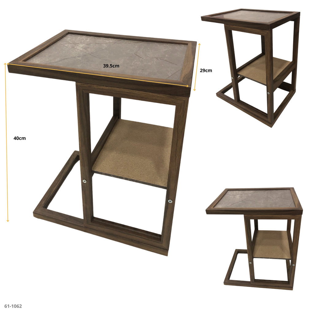 Una mesa auxiliar lateral práctica y elegante, ideal para complementar sofás, camas o rincones de lectura. Su diseño en forma de “C” permite deslizarla cómodamente, ofreciendo una superficie funcional para apoyar bebidas, trabajar con una laptop o colocar accesorios decorativos.