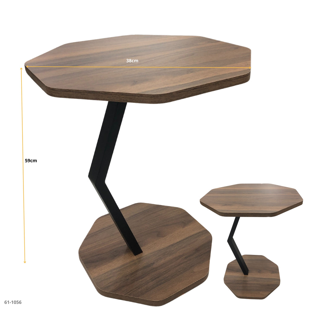 Una mesa auxiliar octagonal con estilo contemporáneo y un acabado cálido que la hace versátil y elegante. Su diseño con base y cubierta de la misma forma geométrica, unidas por una estructura metálica en diagonal, aporta un toque moderno y distintivo, ideal para realzar salas, dormitorios o áreas sociales.