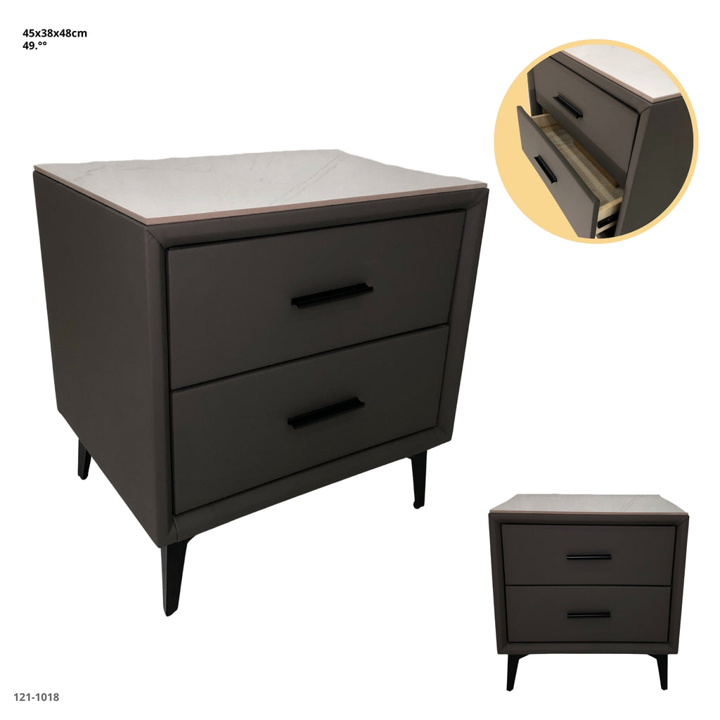 Mesa de noche moderna de 2 gavetas, ideal para complementar tu dormitorio con un diseño minimalista y funcional. Su acabado en tono oscuro con cubierta tipo mármol agrega un toque elegante y sofisticado.