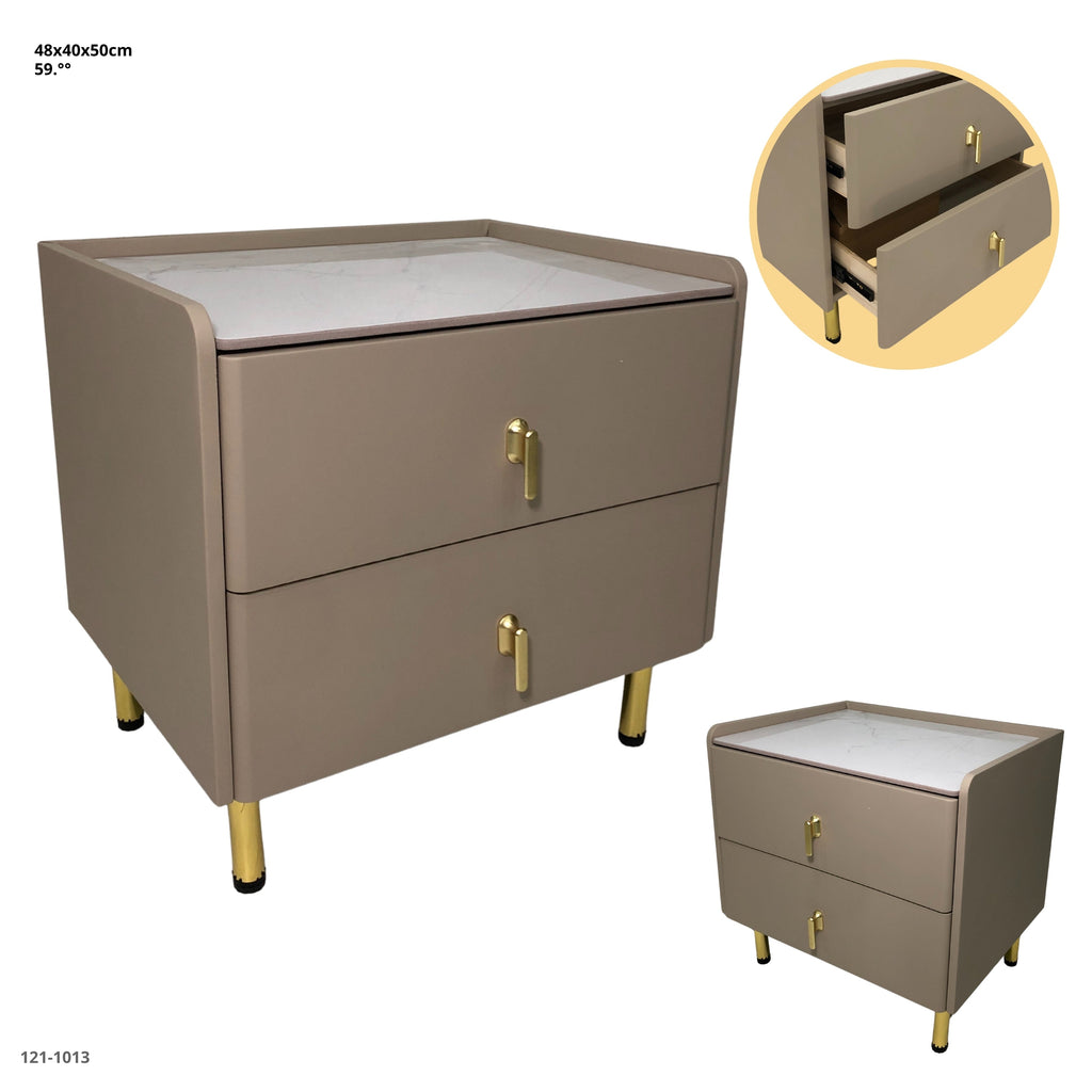 Mesa de noche moderna con 2 gavetas en acabado beige claro, tiradores metálicos dorados y patas metálicas doradas que le aportan un toque elegante y sofisticado. Incluye superficie superior tipo mármol, ideal para decoración, lámparas o accesorios personales.