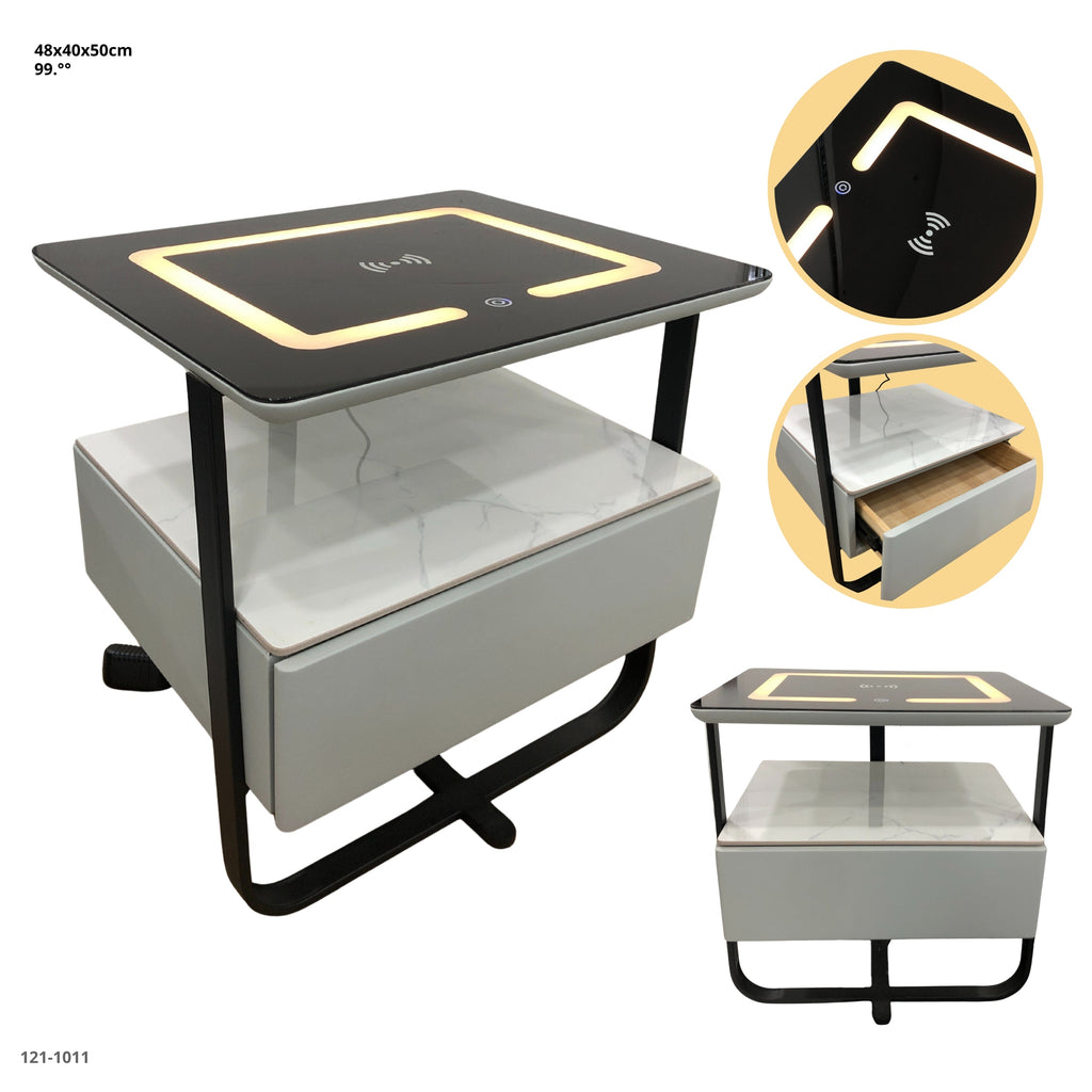 Mesa de noche moderna y tecnológica, con diseño en negro y gris claro con cubierta tipo mármol. Equipada con cargador inalámbrico integrado y iluminación LED decorativa en la parte superior, ideal para habitaciones elegantes y funcionales. Dispone de un cajón oculto que se desliza con suavidad para mayor almacenamiento.