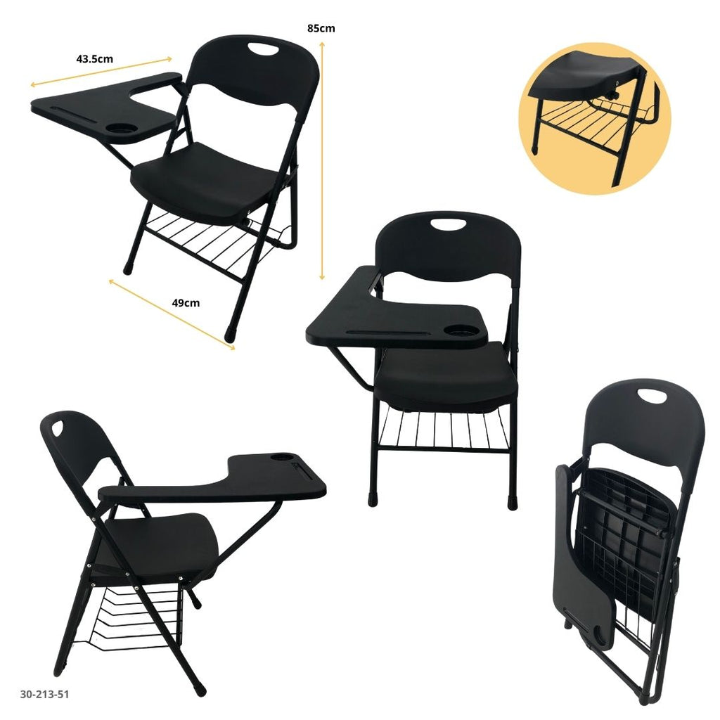 Esta silla pupitre plegable en color negro combina practicidad, comodidad y resistencia, ideal para entornos educativos, capacitaciones o salas de conferencia.