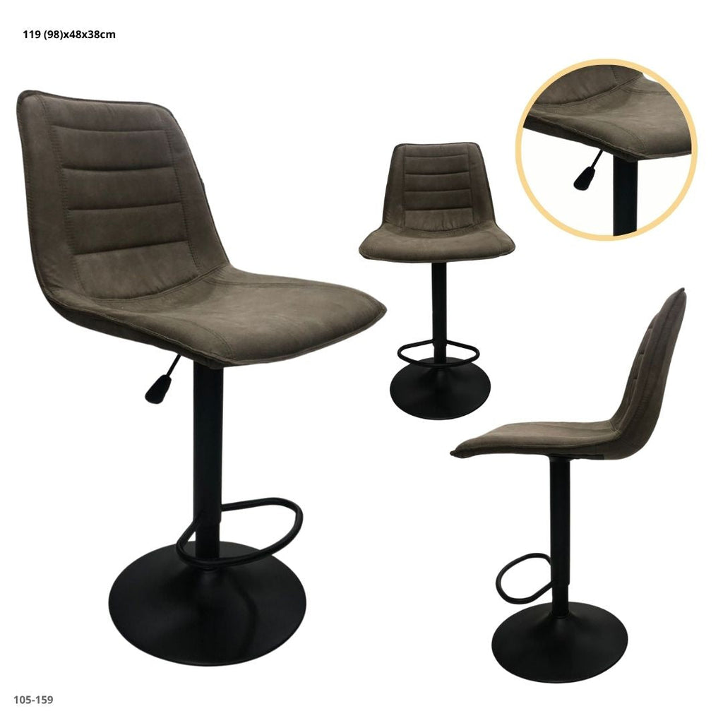 Taburete giratorio de diseño moderno y minimalista, tapizado en tela tipo gamuza color gris claro. Su asiento acolchado con costuras horizontales y respaldo ergonómico brindan un extra de confort, mientras que la base metálica negra mate con reposapiés integrado garantiza firmeza y estabilidad.