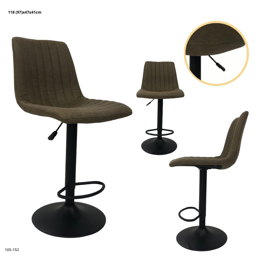 Taburete giratorio con respaldo, tapizado en tela tipo gamuza color marrón. Su diseño con costuras verticales aporta un estilo elegante y minimalista, mientras que el asiento acolchado ofrece comodidad. La base metálica negra mate con reposapiés integrado brinda firmeza y estabilidad.
