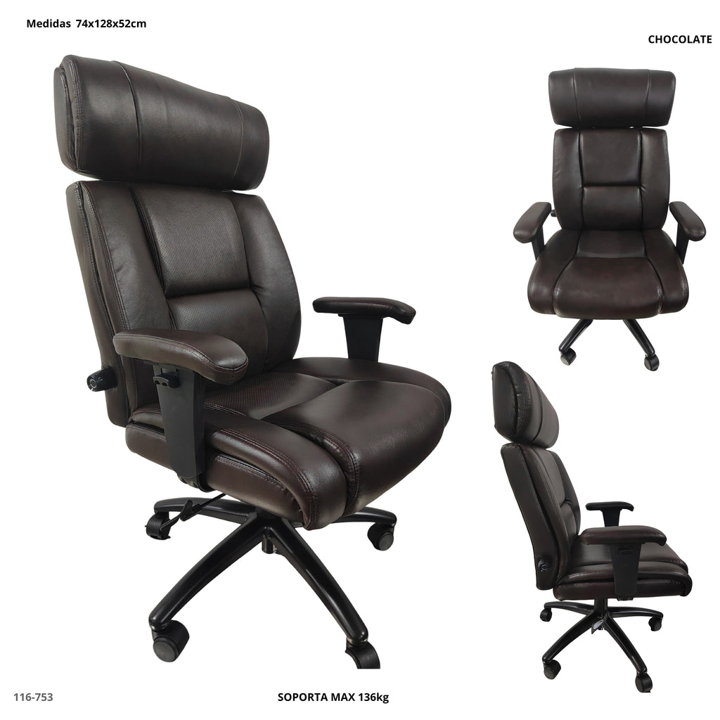 Silla ejecutiva de diseño robusto con acabado en cuero sintético color chocolate. Su respaldo alto con doble acolchado y asiento ergonómico proporcionan máximo confort durante largas jornadas de trabajo.