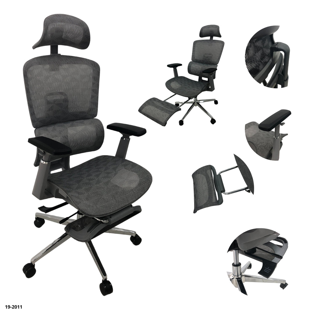 Cuenta con respaldo en malla transpirable, cabecera ajustable, soporte lumbar, reposabrazos ergonómicos, mecanismo reclinable con bloqueo y reposapiés retráctil para mayor confort.