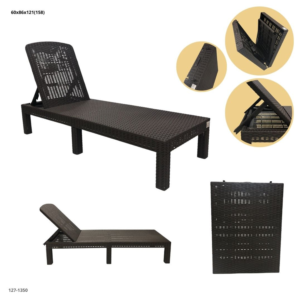 Una sofisticada tumbona reclinable con acabado tipo rattan, ideal para disfrutar del descanso en terrazas, jardines o zonas de piscina. Su diseño elegante combina la resistencia del plástico con la estética del tejido rattan, creando un mueble funcional y decorativo al mismo tiempo.