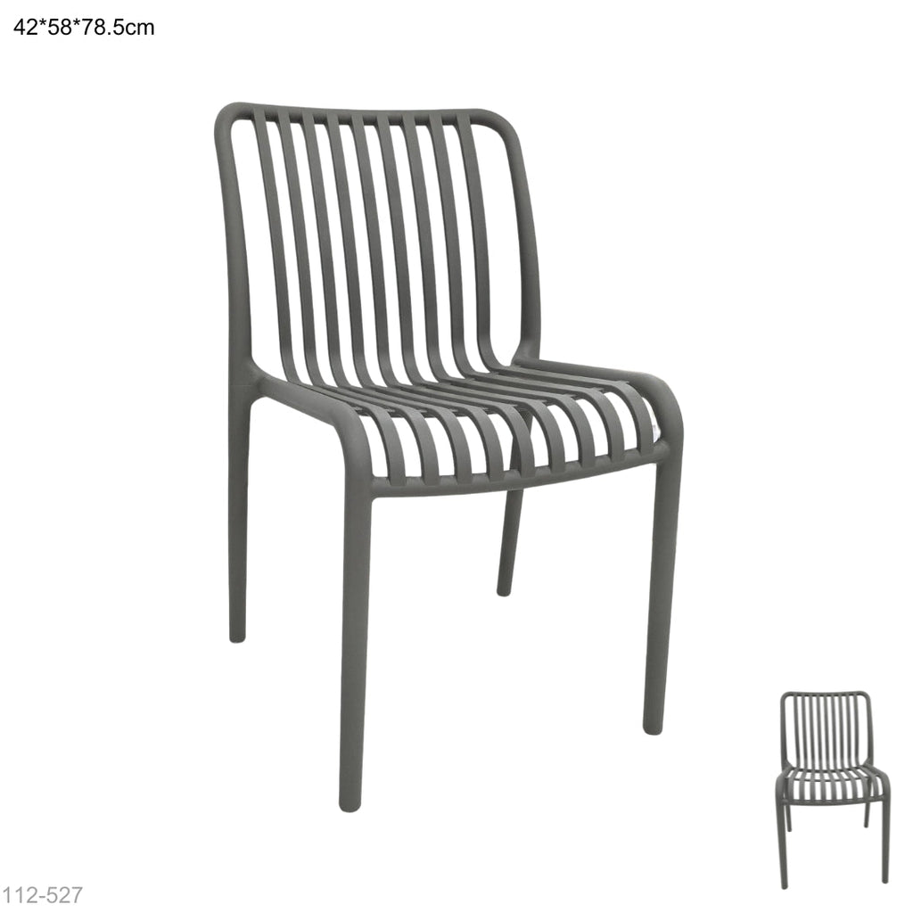 Silla moderna fabricada en plástico de alta resistencia, con diseño de barras verticales que le da un estilo minimalista y elegante. Su estructura ligera la hace fácil de mover y apilar, ideal para interiores y exteriores en comedores, terrazas, restaurantes, cafeterías o jardines.