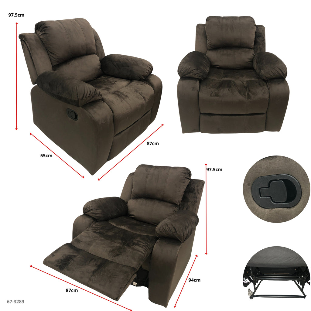 Sillón reclinable individual tapizado en tela color chocolate, diseñado para brindar comodidad y estilo en el hogar. Su sistema reclinable manual permite extender el reposapiés para un descanso más cómodo.