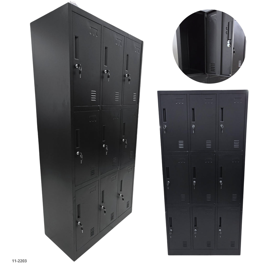 Locker metálico de 9 puertas, fabricado en acero resistente con acabado en pintura negra electrostática para mayor durabilidad. Cada compartimiento cuenta con cerradura individual y ranura para ventilación, ideal para mantener pertenencias seguras y organizadas en oficinas, gimnasios, colegios o empresas.