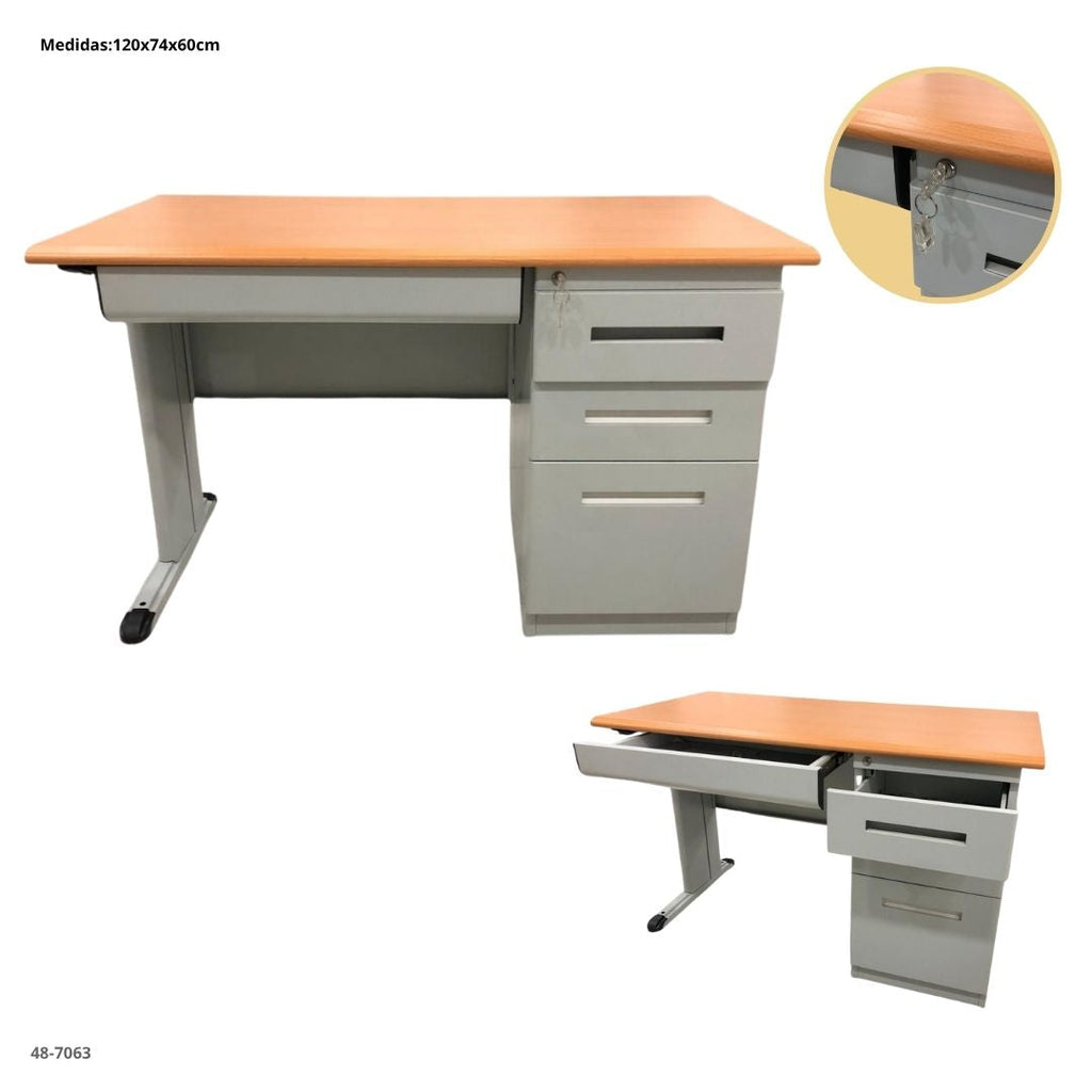 El cajón superior incluye una bandeja deslizable para útiles, y los inferiores ofrecen amplio espacio para archivos o material de oficina.