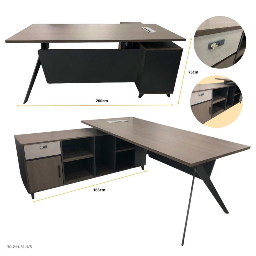Este escritorio ejecutivo tipo “L” con extensión lateral ofrece un diseño moderno, amplio y funcional, ideal para oficinas profesionales o espacios de trabajo en casa. Su combinación de tonos madera y negro proyecta elegancia, mientras que la estructura metálica refuerza la estabilidad y durabilidad del mueble.