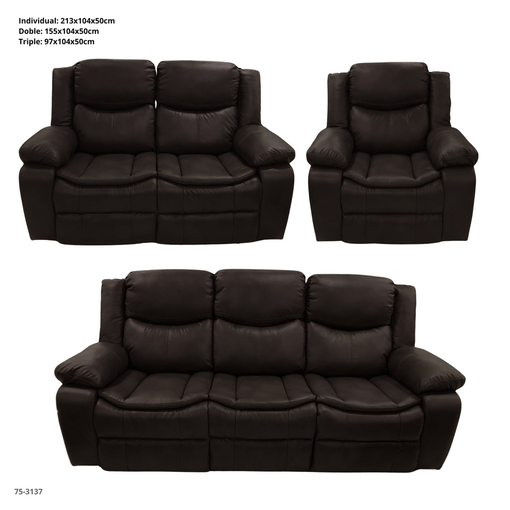 Un elegante set de sofás reclinables diseñado para ofrecer comodidad y estilo en tu sala. Tapizado en cuero sintético color chocolate, combina resistencia con un acabado cálido y sofisticado que realza cualquier espacio.