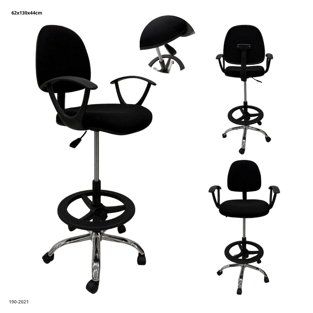 Cuenta con asiento acolchado en tela, respaldo ergonómico curvado, y reposabrazos fijos que proporcionan una postura cómoda. Incorpora un aro reposapiés ajustable para mayor descanso y base metálica cromada con ruedas que permiten movilidad y estabilidad.
