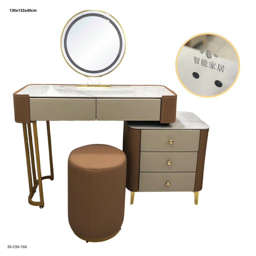 Este tocador elegante con espejo iluminado combina diseño contemporáneo y acabados de lujo, ideal para añadir un toque sofisticado a cualquier dormitorio. Su estructura en tonos beige y café, junto con los detalles metálicos dorados, crea una apariencia moderna y refinada.